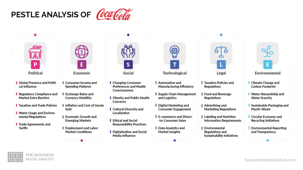 PESTLE analysis, similar to the SWOT analysis is an analytical framework used to evaluate the macro-environmental factors that can influence a company’s operations and strategic decisions. It provides a comprehensive understanding of the external factors affecting an organization. In the case of Coca-Cola, the Coca Cola PESTLE analysis allows the company to identify both potential threats and lucrative opportunities that arise from changes in the broader business environment.